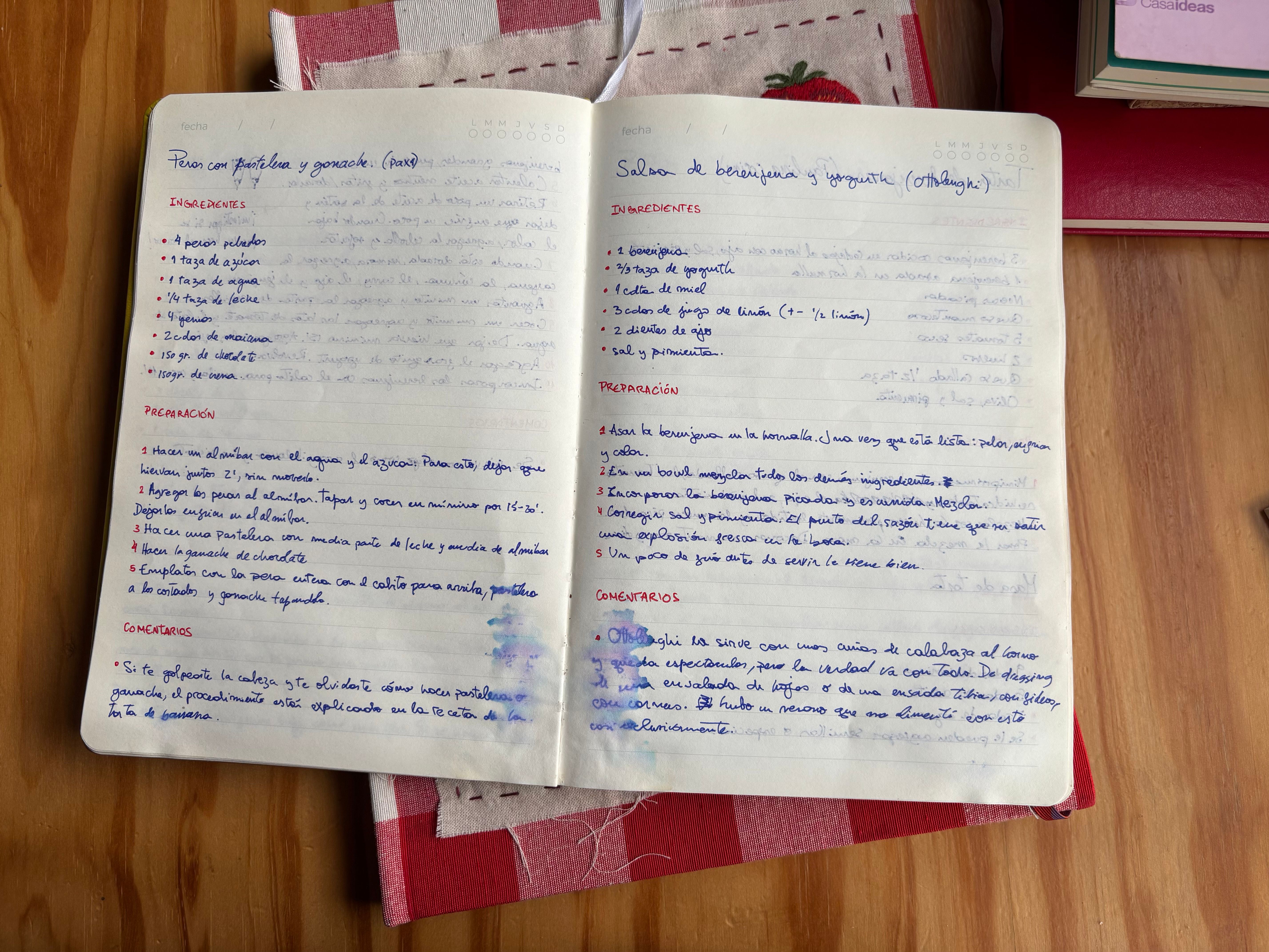 Un cuaderno de recetas es un registro de lo que todavía no aprendimos. Anotamos ahí recetas que probamos una vez desde otra fuente (un reel, un libro, un mensaje de whatsapp que alguien mandó después de probar algún postre riquísimo en una cena) y que anotamos en un doble juego: por un lado, para que sea más fácil volver a ella la próxima vez que queramos prepararla, para acordarnos que existe; por el otro, para empezar el lento proceso de incorporaciones.
